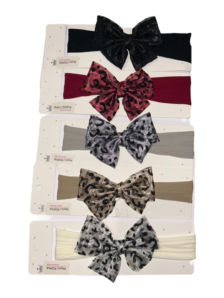 Παιδική κορδέλα για τα μαλλιά με φιόγκο με λεοπάρ σχέδια, ελαφριά γυαλιστερό. Η συγκεκριμένη παιδική κορδέλα μαλλιών έχει πολύ απαλή υφή και αρκετή ελαστικότητα, καθώς διαθέτει λάστιχο, με αποτέλεσμα να μην σφίγγει το κεφαλάκι του παιδιού. Οι συγκεκριμένες κορδέλες μπορούν να φορεθούν όλες τις ώρες τις ημέρας, είτε με casual είτε με επίσημη ένδυση. Κάθε συσκευασία περιέχει 1 τεμάχιο.