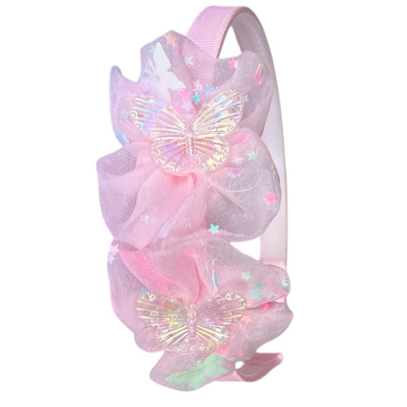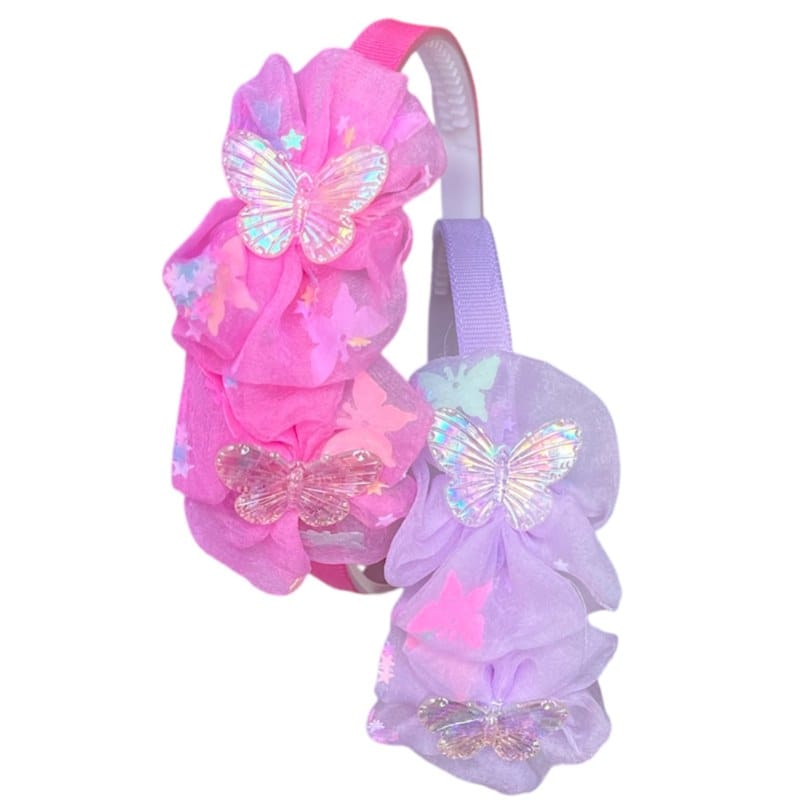 Παιδική στέκα μαλλιών πλαστική με σατέν βάση, με 2 πεταλουδίτσες πάνω σε φιόγκους από τούλι γεμισμένους με πολύχρωμα κομφετί, σε διάφορες αποχρώσεις. Η στέκα μαλλιών μας για παιδιά είναι σχεδιασμένη με παιχνιδιάρικες και πολύχρωμες λεπτομέρειες. Η άνετη στέκα είναι απαλή στο ευαίσθητο τριχωτό της κεφαλής και παραμένει σταθερά στη θέση της, καθιστώντας την το τέλειο αξεσουάρ για παιδιά. Αντέχει στη φθορά της καθημερινής χρήσης, διασφαλίζοντας ότι θα γίνει ένα αγαπημένο αξεσουάρ που διαρκεί για τα επόμενα χρόνια. Η ευέλικτη σχεδίαση της συμπληρώνει κάθε χτένισμα, είτε πρόκειται για ένα καθημερινό είτε για ένα επίσημο look.